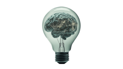 Conceptual image of a transparent light bulb containing a glowing brain, isolated on a white background. Symbol of intelligence, creativity, and innovation. Ai generative
