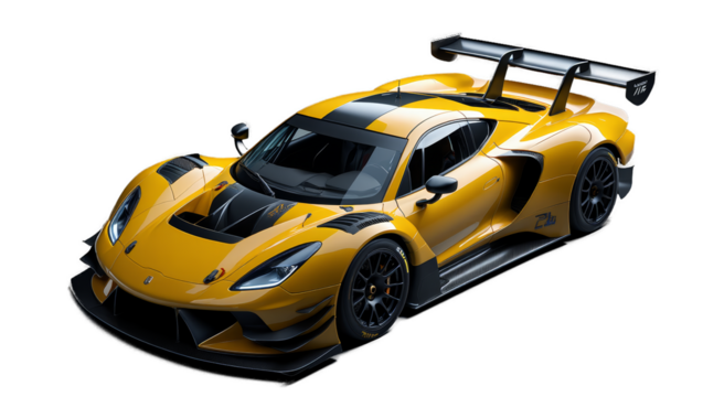 Sleek yellow high-performance sports car with advanced aerodynamics and a large rear wing, isolated on a clean white background for easy editing
