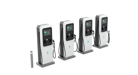 Row of modern electric vehicle charging stations with digital displays and charging cables, electric car infrastructure, clean energy solution