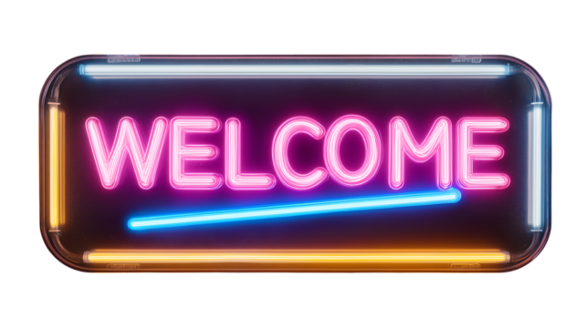 Vibrant pink neon sign spelling welcome glows brightly against a suggesting an inviting entrance to a modern retro establishment or event space