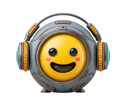 Cute smiling robot emoji character with headphone listening to music. This joyful AI assistant mascot has futuristic design and adorable cartoon technology look