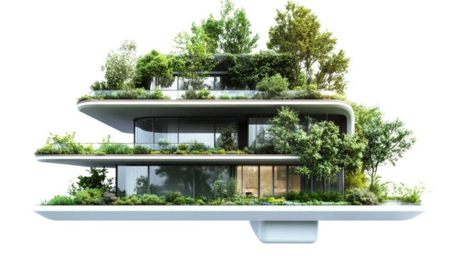 Multi level futuristic home surrounded by lush greenery isolated on white background
