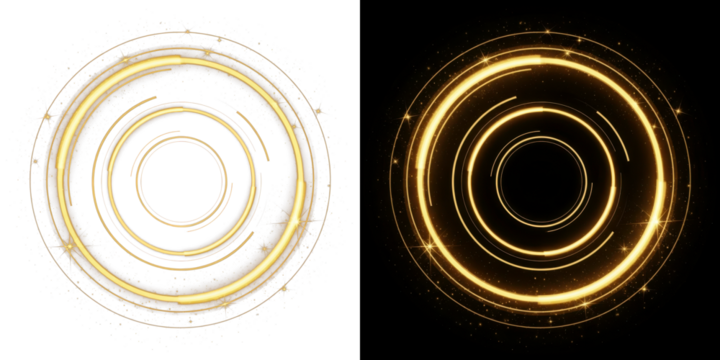 A mesmerizing digital illustration of glowing golden circles on a black background