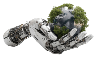 PNG of A futuristic robotic hand gently cradling a vibrant planet Earth with lush greenery, symbolizing harmony and innovation.