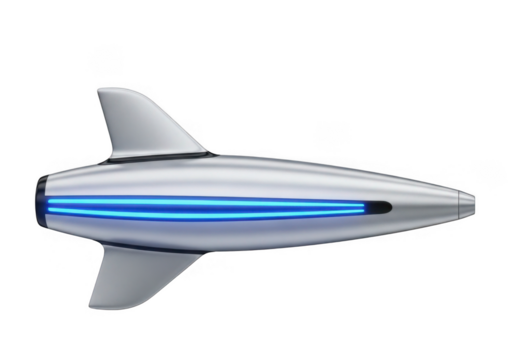 Futuristic silver rocket ship with blue glowing lights isolated on transparent background for space exploration and sci fi themes