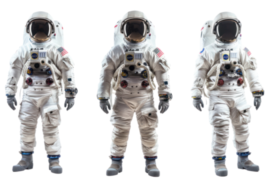 Astronauts in spacesuits set in different poses isolated on transparent and white background Real daytime first person perspective