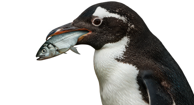 A galapagos penguin isolated on transparent background is holding a fish in its beak, ready to eat it in the wild nature