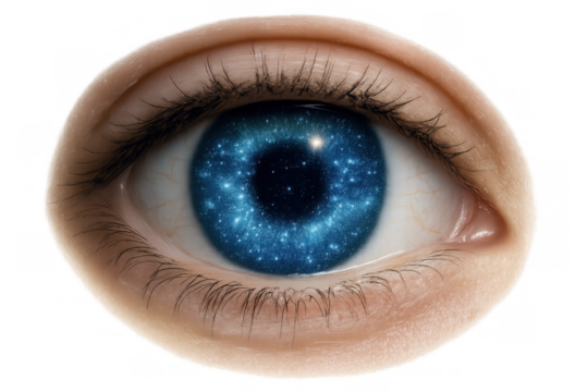 Photorealistic eye with blue and purple galaxy in the iris, transparent background PNG