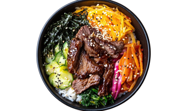 korean bibimbap bowl with galbi beef and pickled vegetables shot from top view. Isolated on a transparent background - generated by ai
