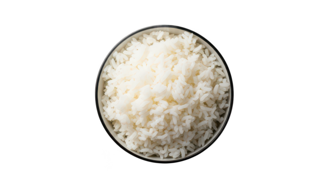 Bowl Of Fluffy White Rice On Black Background Top View