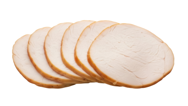 Isolated cooked turkey breast slices in a row on a plain surface, for sandwiches or snacks