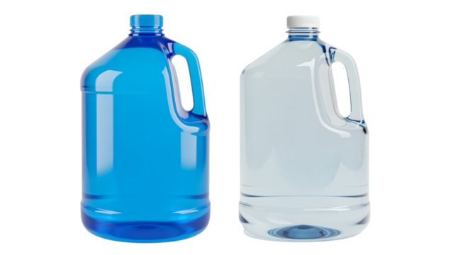 Two clear plastic jugs, one filled with blue liquid, the other with clear. Both have handles and white caps