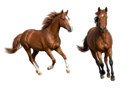 Two chestnut horses running isolated on white background