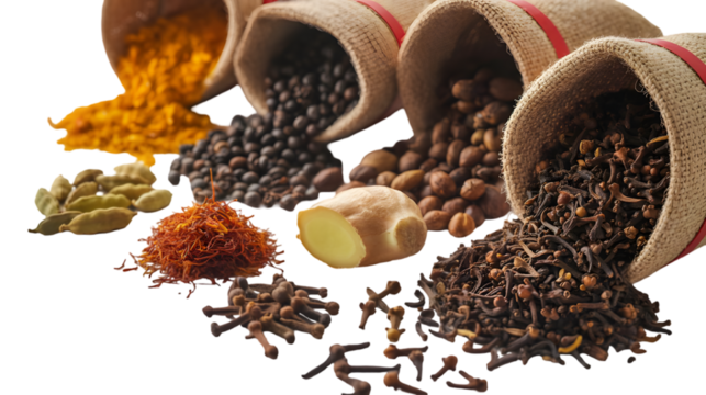 Spices Galore: An assortment of aromatic spices spills from burlap sacks, offering a vibrant palette of flavors and textures. A culinary journey for the senses.