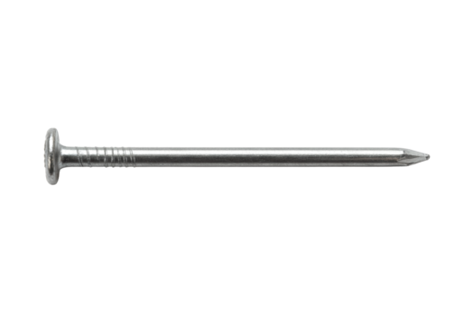 Macro photo of a single galvanized steel nail horizontally on a transparent background with copy space. Concept of industrial precision and utility