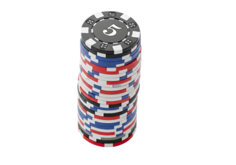 Stack of colorful casino chips, five denomination, isolated on white background, symbolizing gambling and risk
