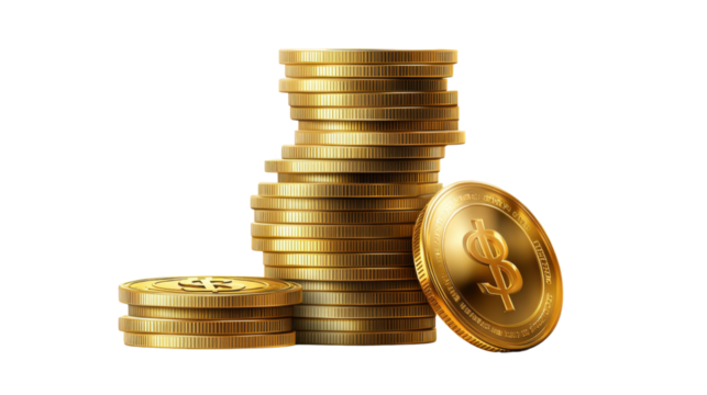 "A set of gold coins stacked neatly in perfect order, isolated on transparent background, exuding a sense of wealth and timeless value."