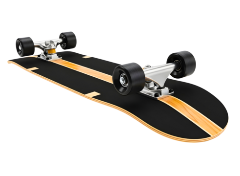 Black skateboard with yellow stripe and four wheels on transparent background