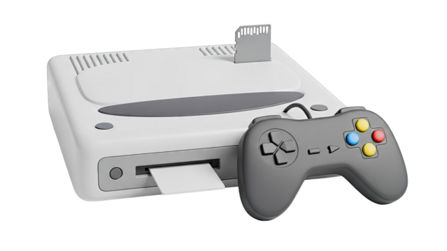 3d retro gaming console on transparent background with pixel screen