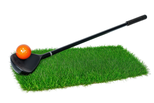 Orange golf ball on a black golf club,  placed on a artificial turf.