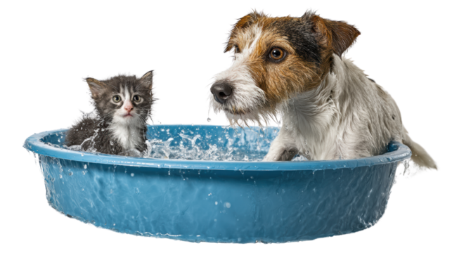 A playful kitten and a dog splashing water in a blue tub, showcasing a joyful moment of friendship.