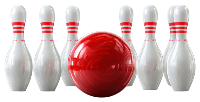 A 3D rendered image featuring a bowling ball and ten pins arranged in a classic setup