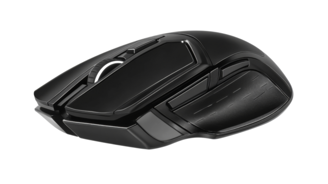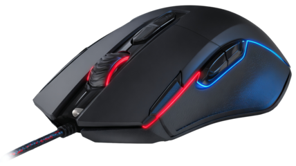 Isolated black gaming mouse with red and blue accents — high-resolution transparent-background PNG-style cutout, ergonomic RGB gamer peripheral for product mockups, UI/UX previews, e-commerce
