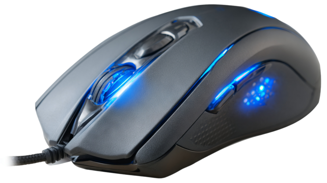 Isolated gaming mouse with blue led lighting — sleek ergonomic design, high-resolution transparent-background PNG-style cutout for product mockups, UI/UX previews, e-commerce thumbnails, web & app