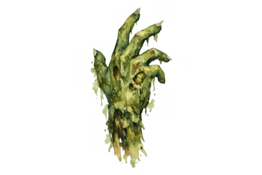 Hand with merry painted finger character in santa hat, transparent background