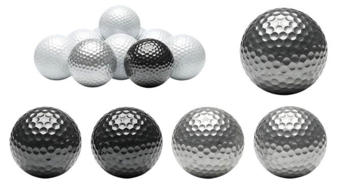 Collection of golf balls in various shades of gray isolated on transparent background, ideal for golfing and sports enthusiasts