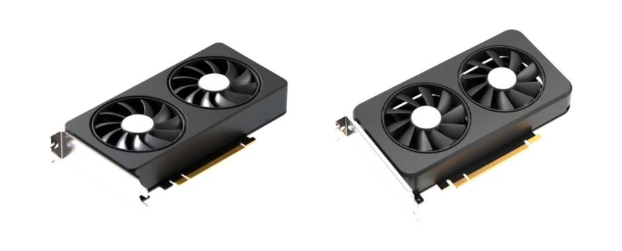 Powerful dual fan GPU graphics card rendering for gaming enthusiasts and high performance computing solutions now isolated on png transparent background