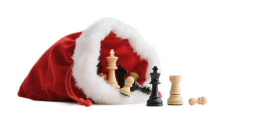 Santa hat filled with chess pieces, combining holiday spirit and chess game elements for festive leisure.