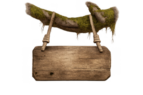 Hanging wooden sign board on mossy branch finding direction, offering information, or showing fantasy world location