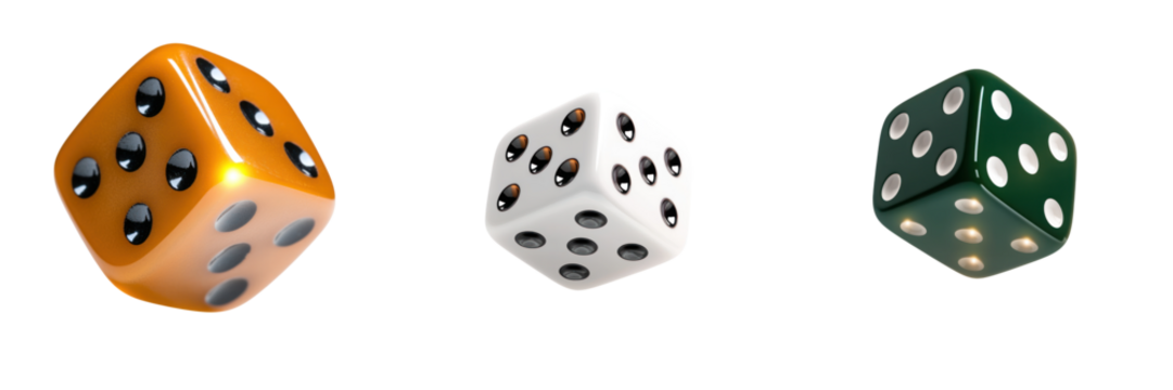 Shiny dice in orange, white, and green colors with glowing edges