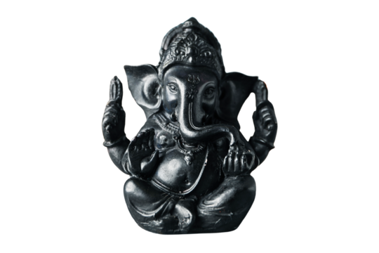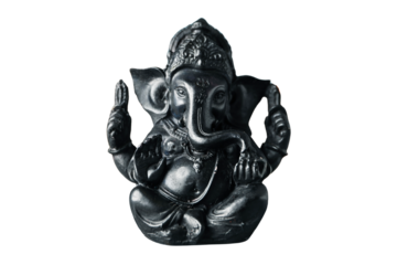 Detailed black sculpture of Lord Ganesh for decor, isolated on white, PNG
