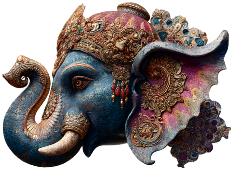 Side Profile of Lord Ganesha Head with Colorful Ornamentation and Textured Details, Angled View, Isolated on Transparent Background