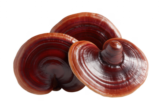 Close up shot of three fresh reishi mushrooms against a transparent background