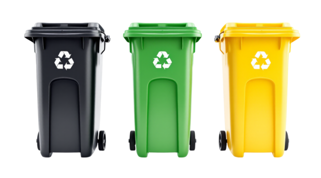 Recycling bin set black green yellow with white recycling symbol on transparent background
