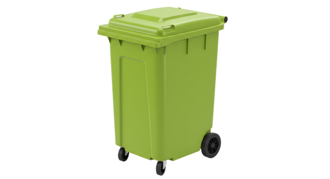 Green wheeled outdoor trash bin with closed lid isolated on white background, ideal for waste disposal and recycling
