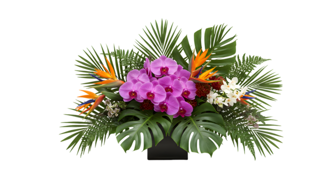 A lush floral arrangement with vibrant orchids and birds of paradise evokes a sense of tropical elegance and natural beauty perfect for special occasions or decorative design.