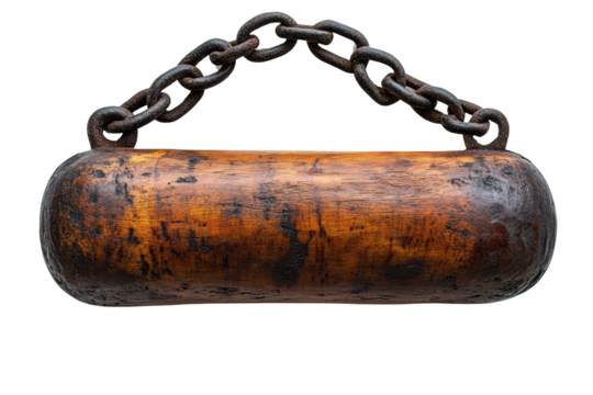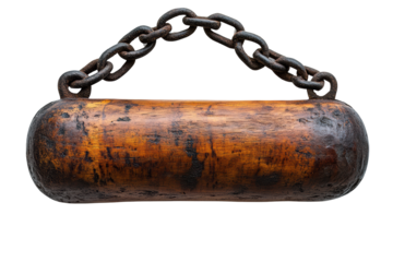 A rustic, weathered wooden log with a metal chain attached, isolated on a white background.