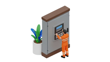 Technician interacting with control panel next to potted plant