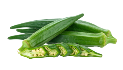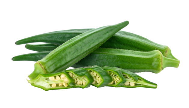 Close-up studio shot of a pile of fresh, green okra pods, some sliced open