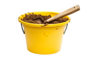 Scooping Dirt with Shovel Inside a Yellow Bucket for Gardening
