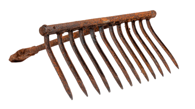 Close-up of a metal garden rake with a wooden handle on a transparent background
