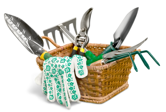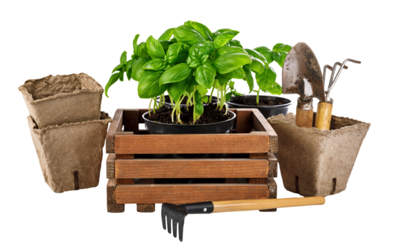 Gardening and farming tools for organic food grawing. Spicy herbs basil in wooden box with garden tool. Isolated. PNG.