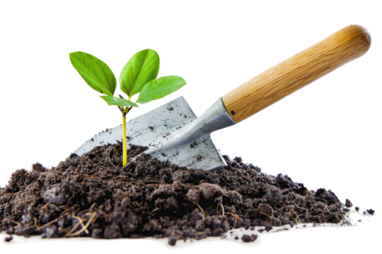 Shovel Digging in Dirt With Plant Growing. On a Clear PNG or White Background.