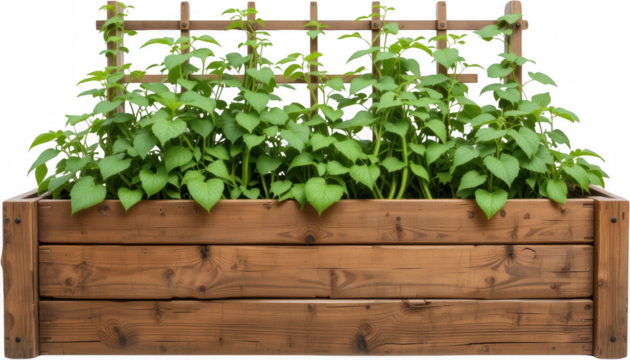 Lush Green Potato Plants Growing in a Wooden Raised Garden Bed with Trellis