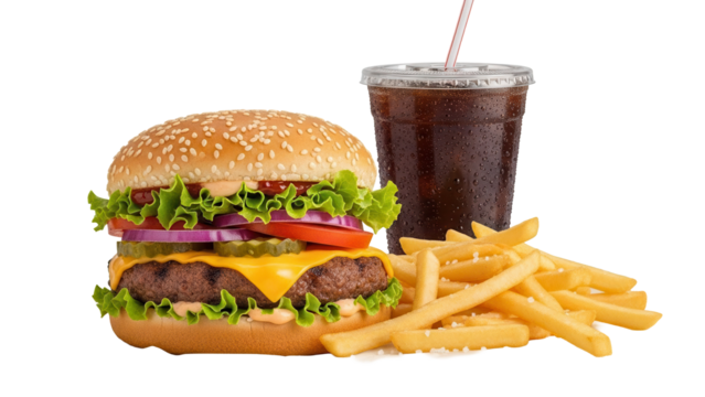 Large burger combo with extra large fries and a jumbo soft drink isolated on white background