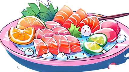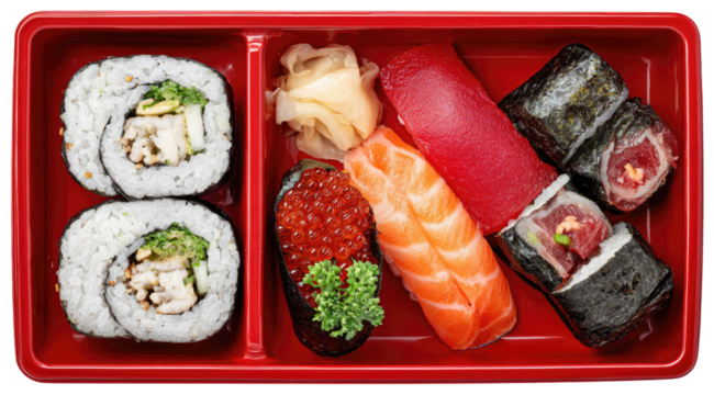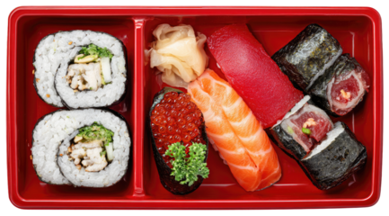Assortment of fresh sushi, including nigiri and maki, isolated on transparent background